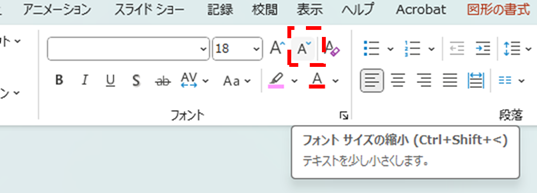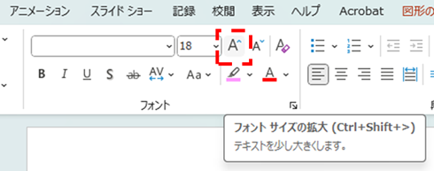 文字のフォントサイズを変更をしたいが、マウスでツールバーのフォント拡大・縮小ボタンをクリックする必要があり、面倒です。