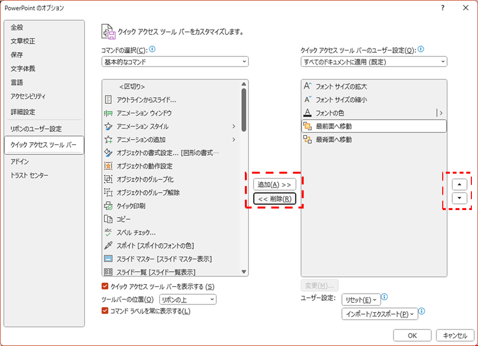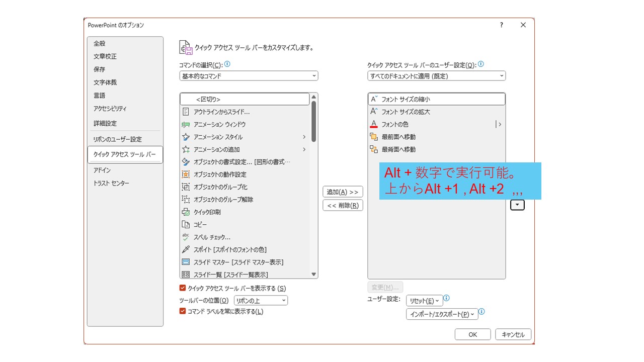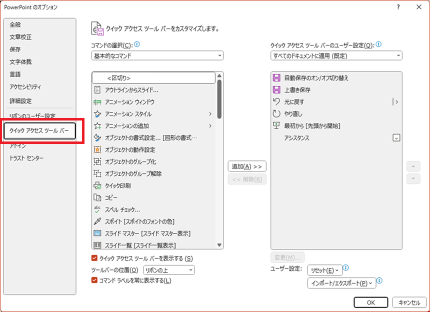 「ファイル」-「オプション」-「クイックアクセスツールバー」でクイックアクセスツールバーの設定を表示します。